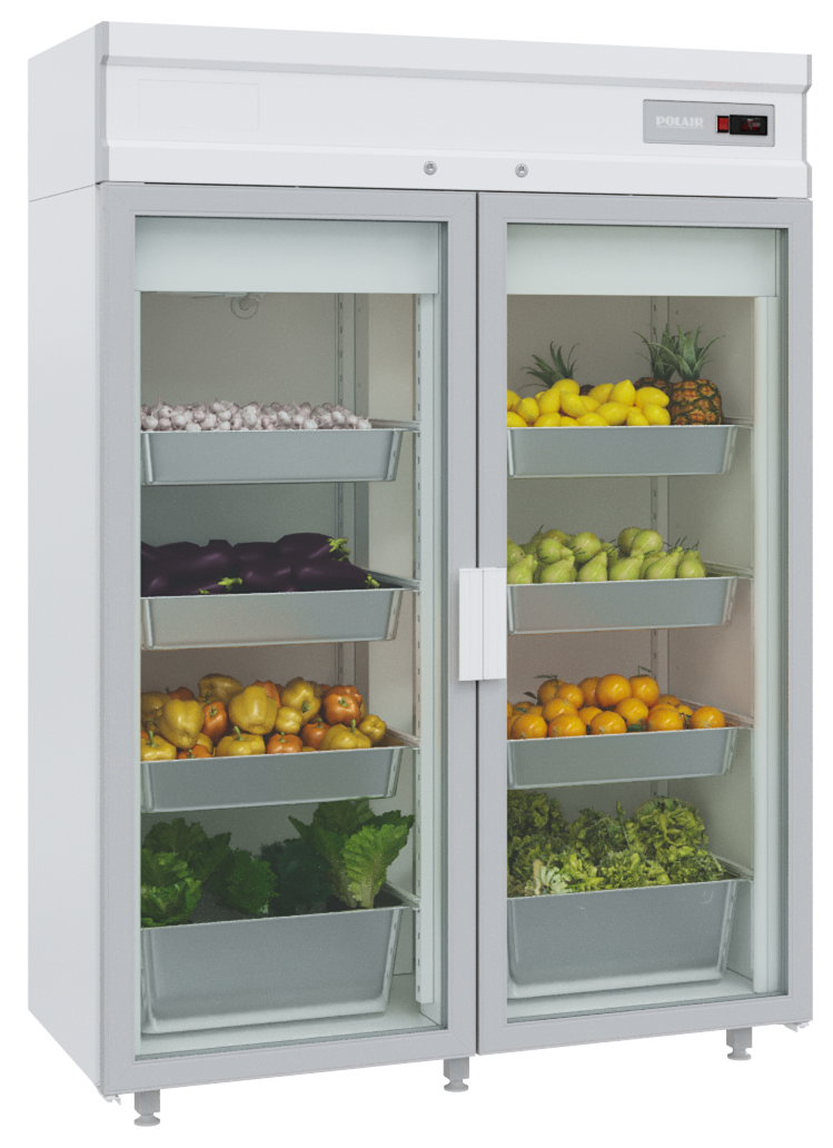 Шкаф увеличенной вместимости с распашными дверьми в алюминиевых рамах с легко заменяемыми стеклопакетами, съемным уплотнителем с магнитной вставкой, механизмом самозакрывания. Полки гастронормированы GN 2/1.