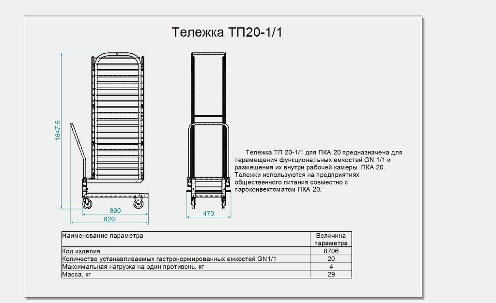 Тележка передвижная ТП-20-1/1 является вспомогательным оборудованием, вмещает 20 гастроемкостей, размером GN 1/1, и используется для их транспортировки и установки в 20-ти уровневом пароконвектомате ПКА-20-1/1 ПП. Имеет съемную ручку для транспортировки и поворотные колеса. Изготовлена из нержавеющей стали.