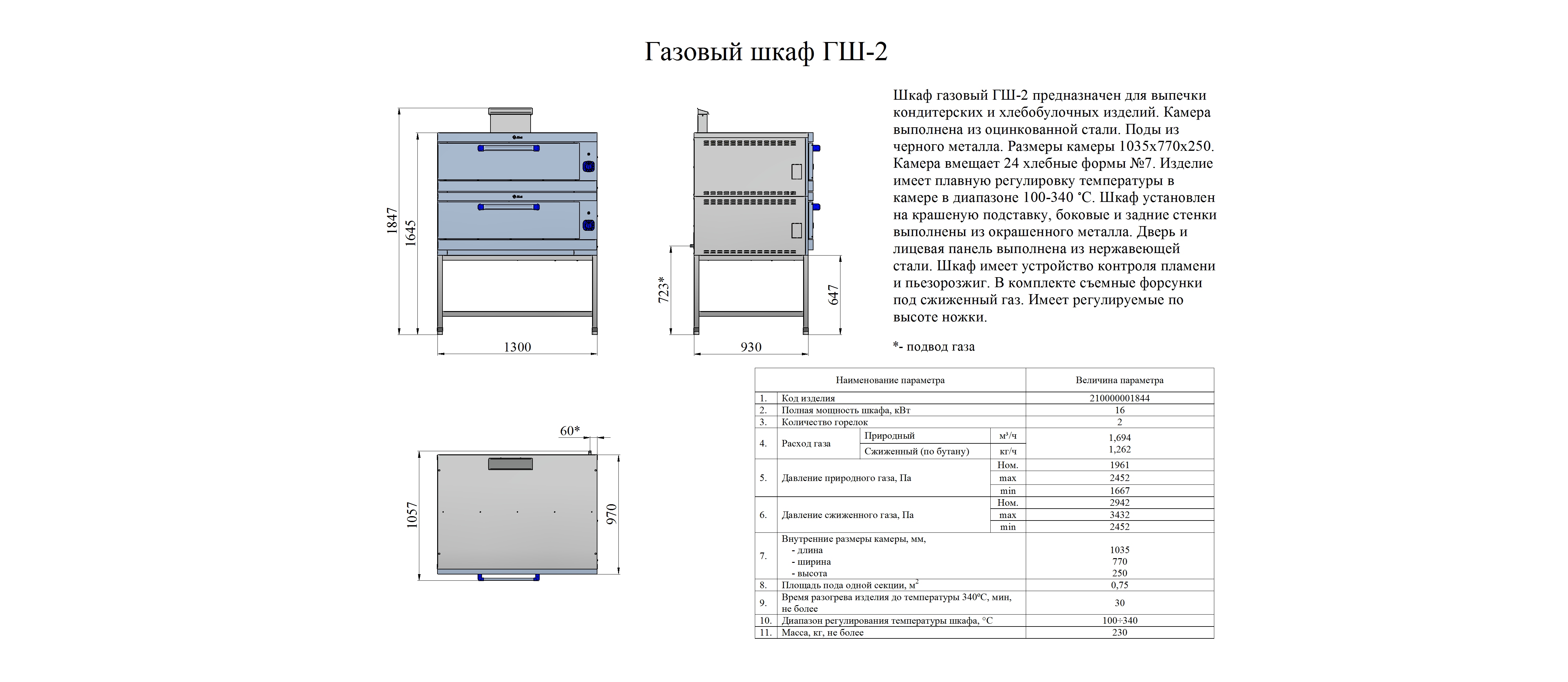 Шкаф газовый ГШ-2 предназначен для выпечки кондитерских и хлебобулочных изделий на предприятиях общественного питания самостоятельно или в составе технологической линии.