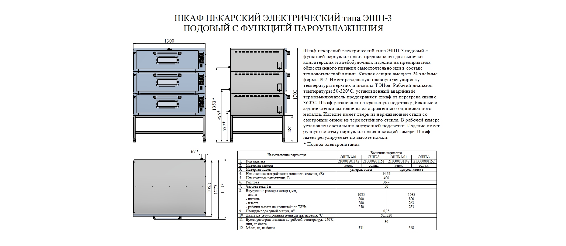 Шкаф пекарский электрический ЭШП-3 подовый с функцией пароувлажнения предназначен для выпечки кондитерских и хлебобулочных изделий на предприятиях общественного питания самостоятельно или в составе технологической линии.
