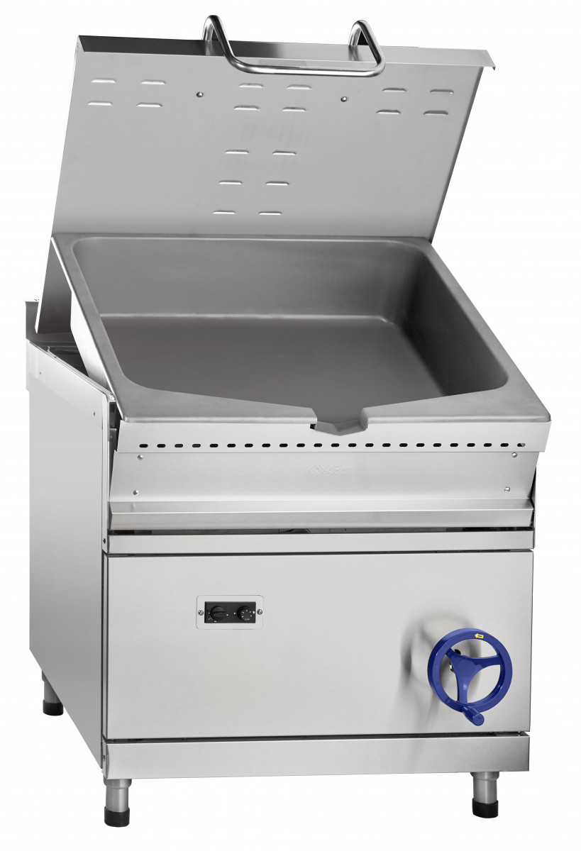 Сковорода имеет плавную регулировку температуры жарочной поверхности в диапазоне 100-340 С. Нагрев осуществляется горелкой, равномерно распределяющей тепло по поверхности чаши. Дно чаши толщиной 10 мм позволяет надежно удерживать тепло в режиме приготовления. Сковорода снабжена механизмом подъема и опускания чаши, что обеспечивает удобство очистки и обслуживания сковороды. Крышка предотвращает потерю тепла и фиксируется в любом положении. Боковая и задняя обшивки изготовлены из крашенного оцинкованного металла. Сковорода имеет регулируемые по высоте ножки.