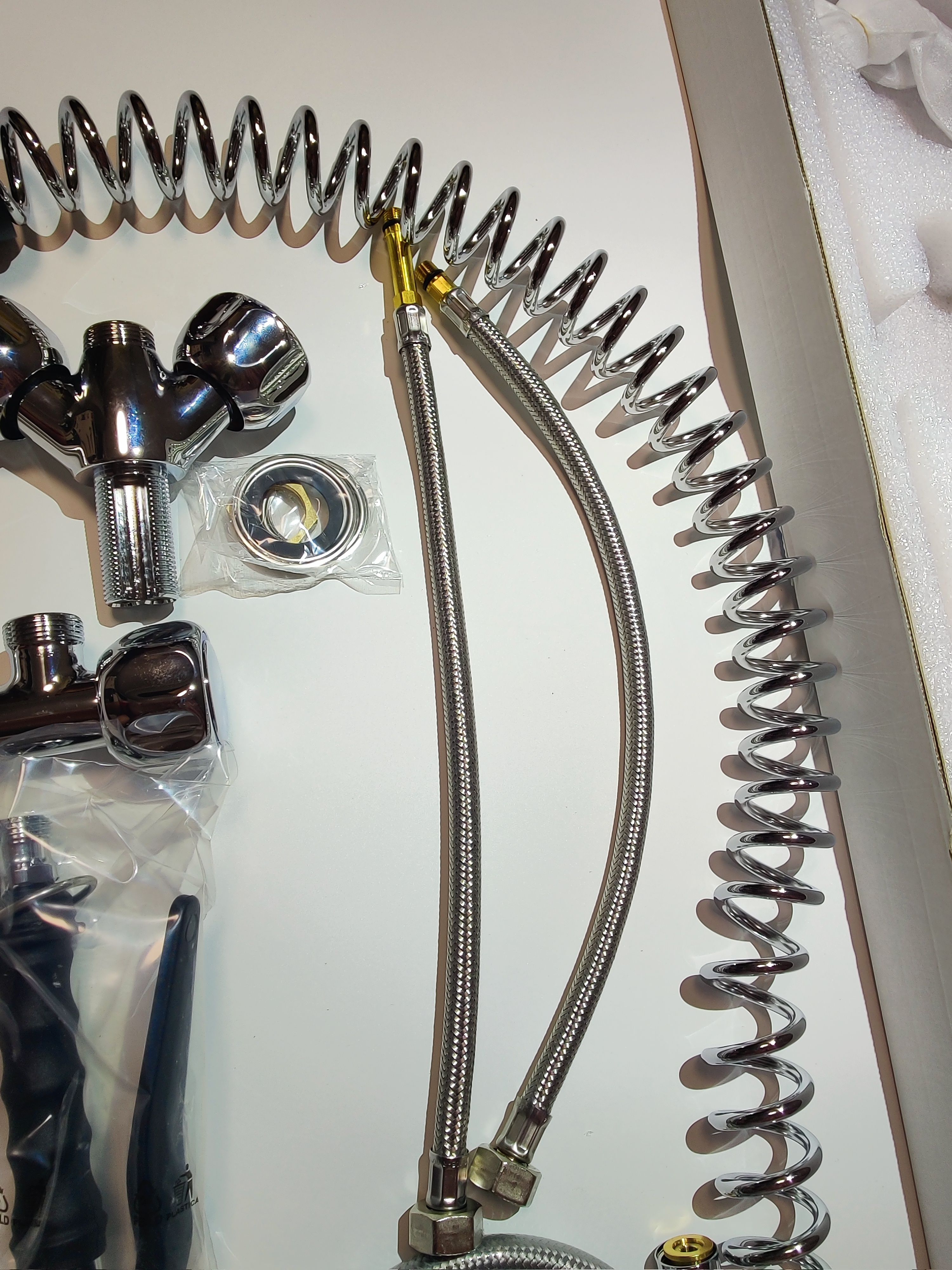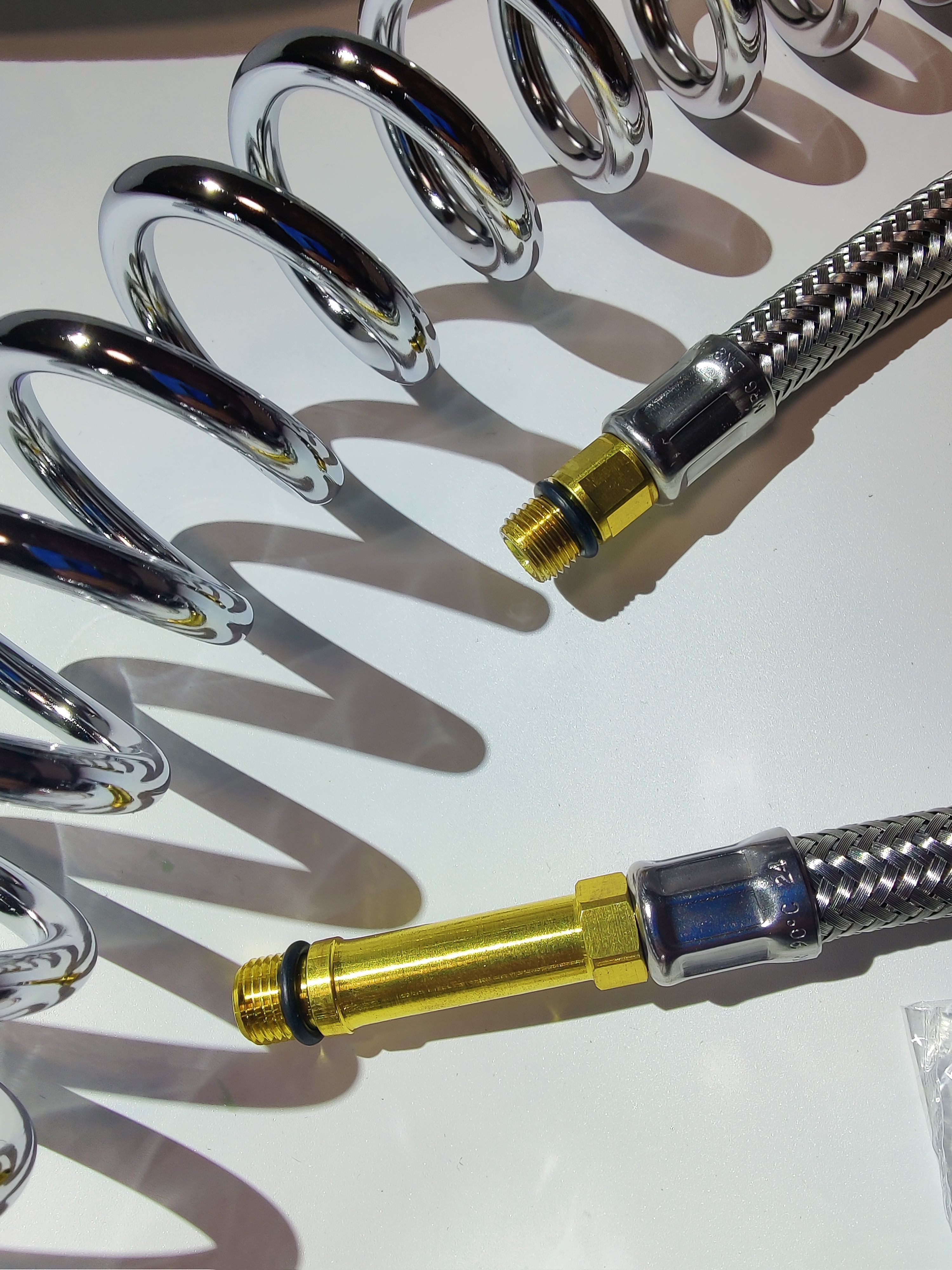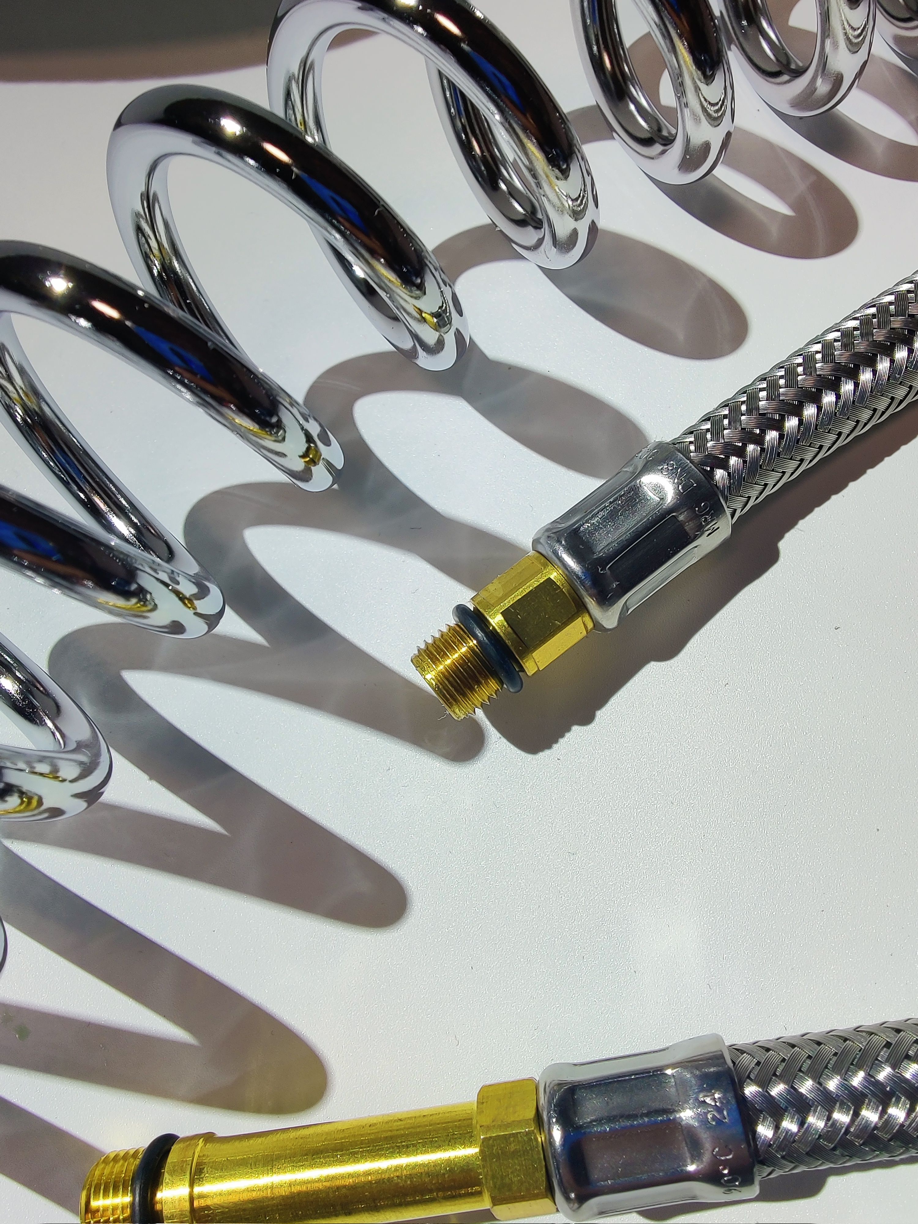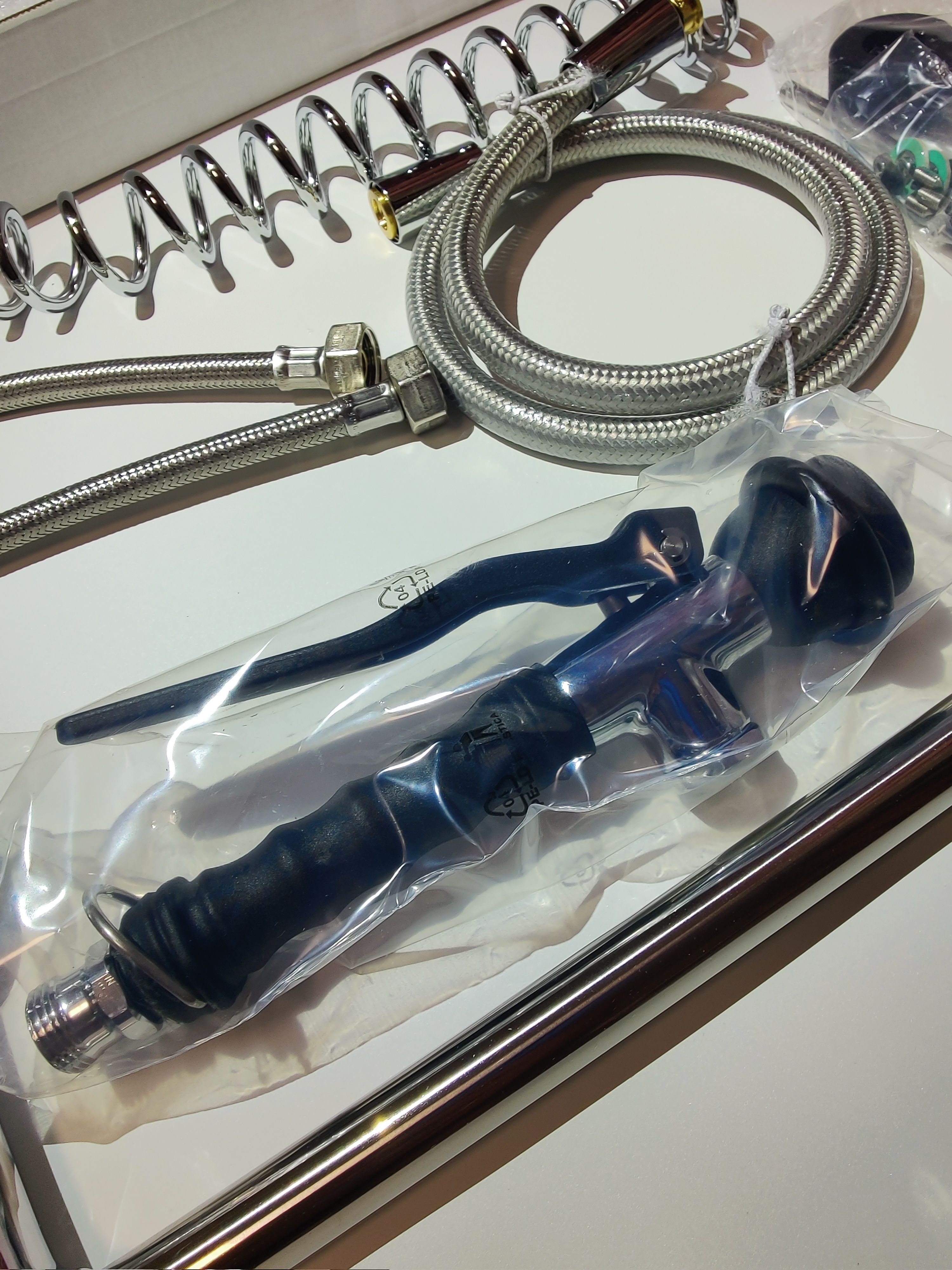 Техническая характеристика: нержавеющая сталь с термопластиком, шланг эластичный (6 Атм), пластиковый.