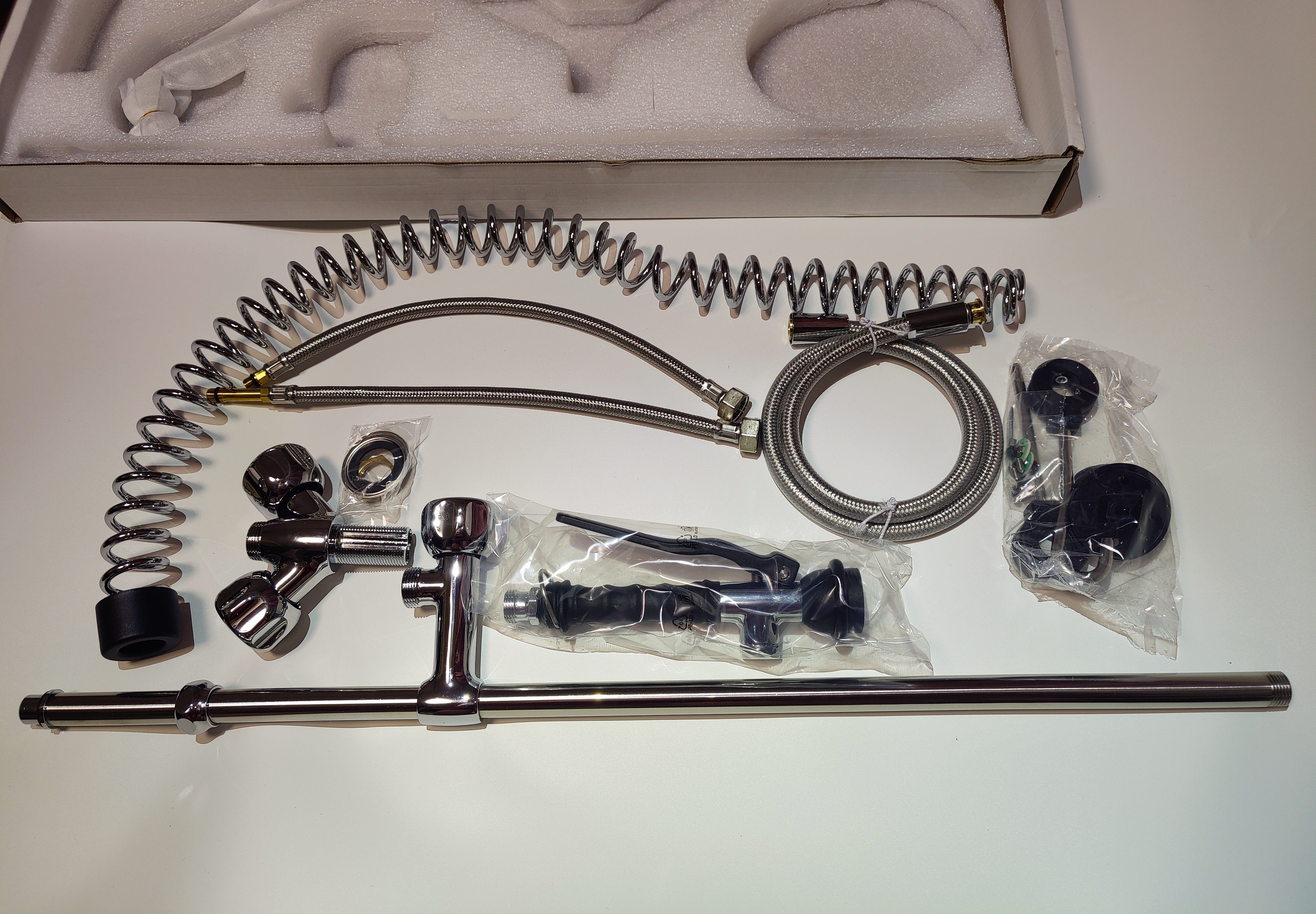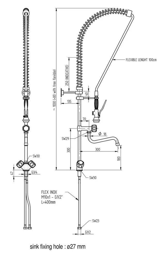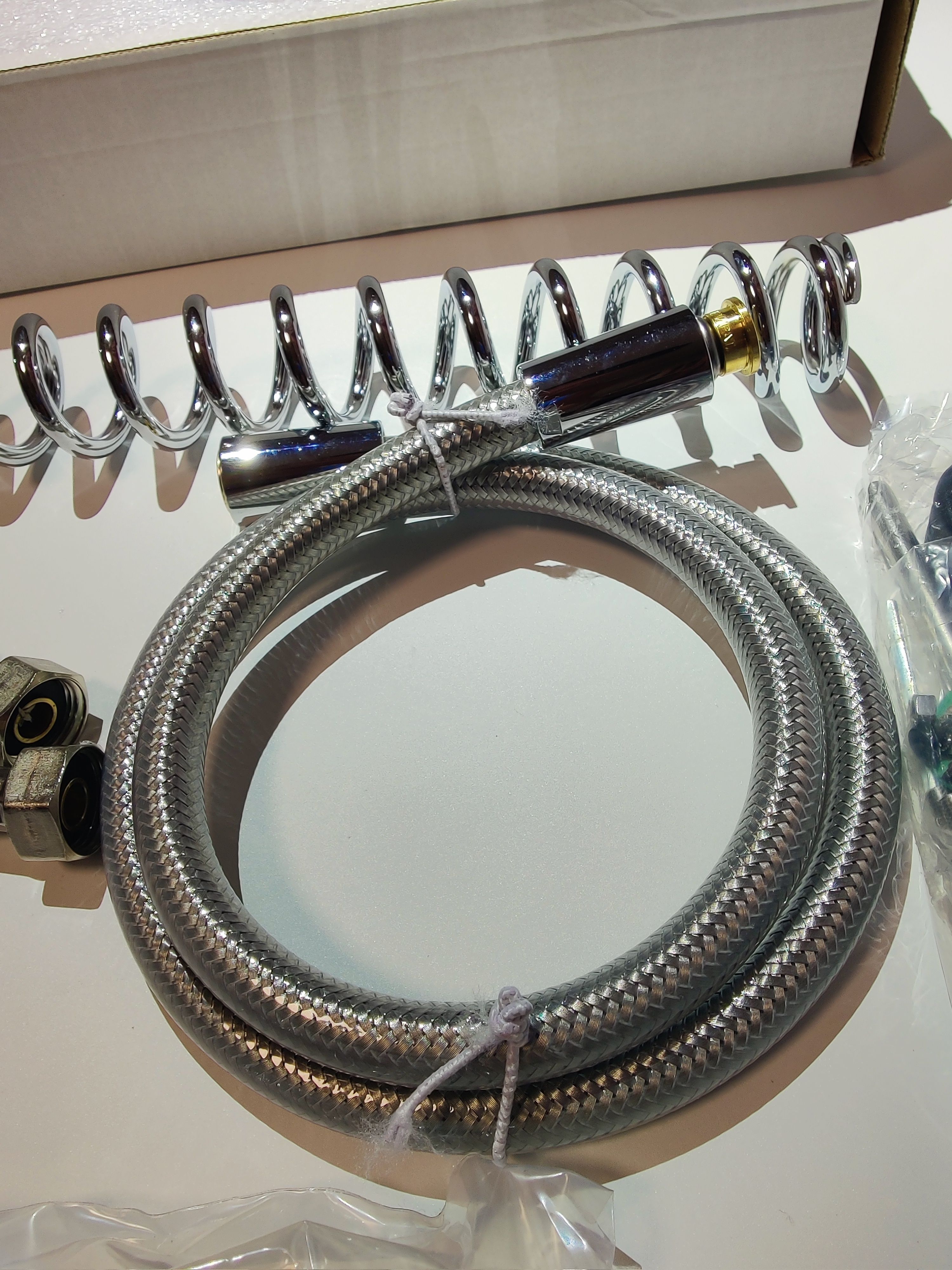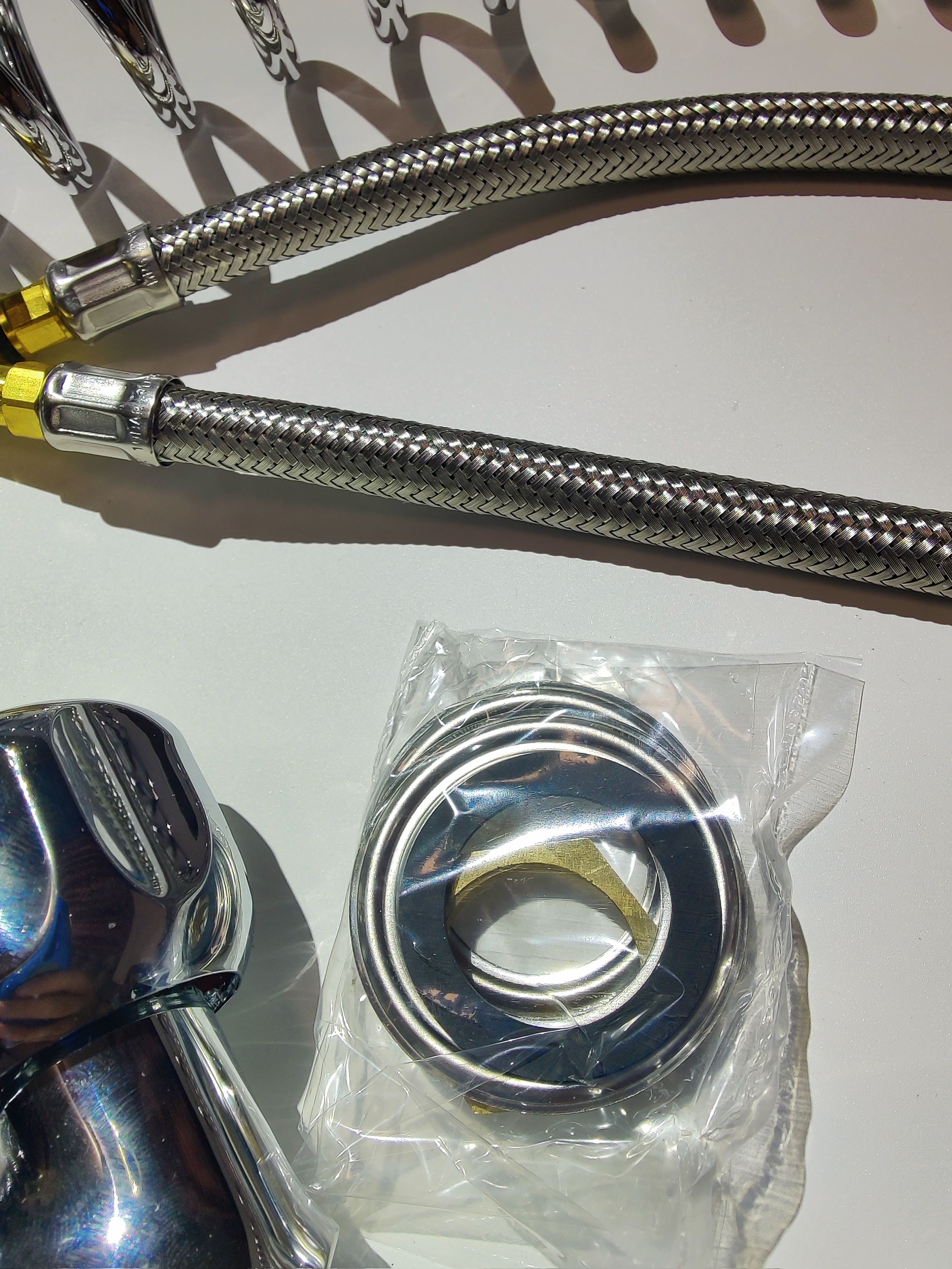 Техническая характеристика: нержавеющая сталь с термопластиком, шланг эластичный (6 Атм), пластиковый.