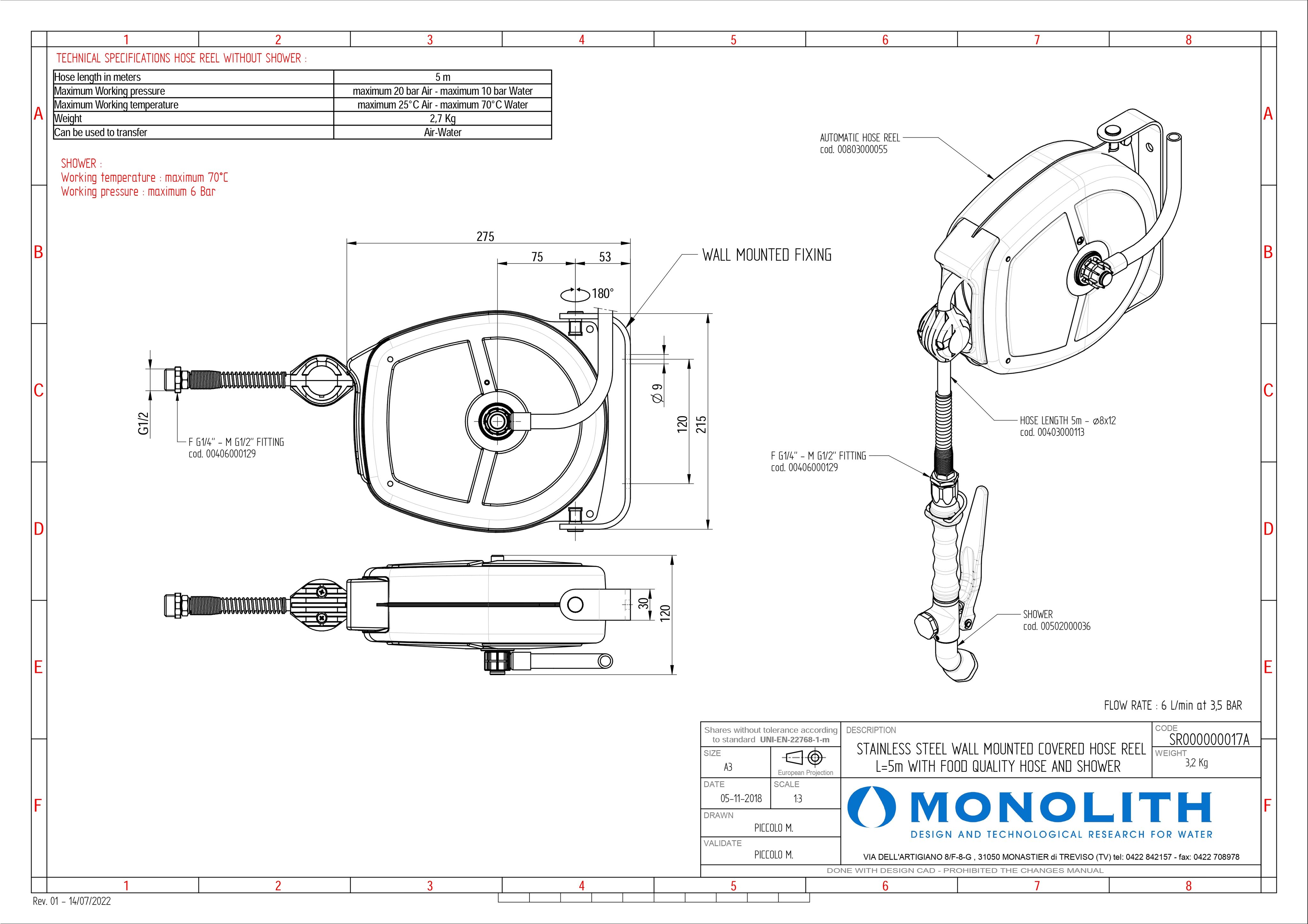 Профессиональная катушка настенная со шлангом MONOLITH SR000000017A длина шланга 5 метров
