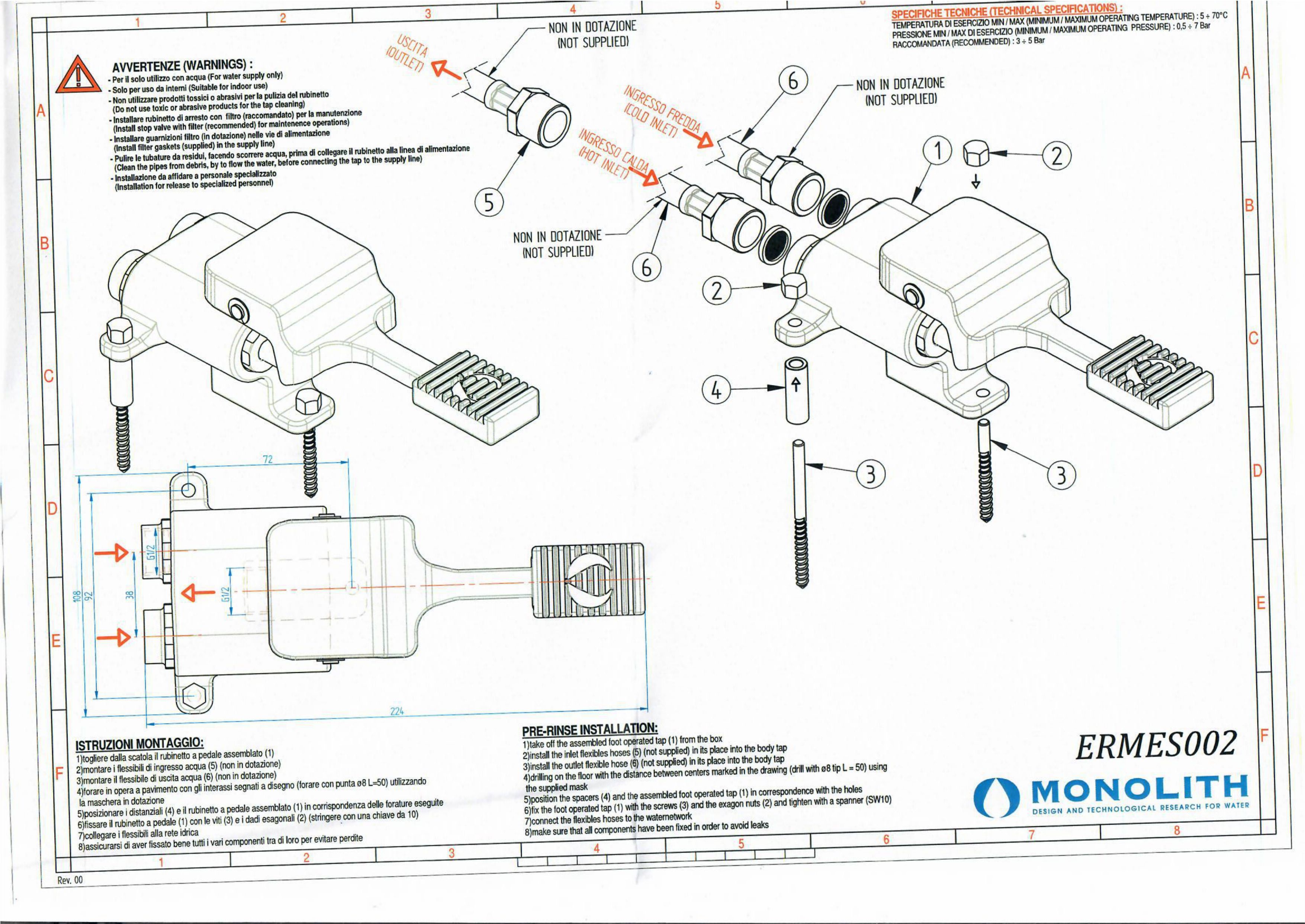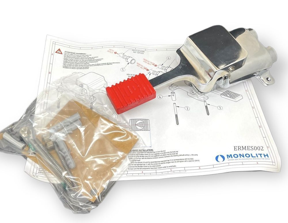 Педальный смеситель MONOLITH ERMES002 используется совместно с изливом на одну трубу и комплектом гибких подводок для установки в общественных местах, барах, ресторанах, пищевых производствах для обеспечения максимальной гигиены, т.к. использование
