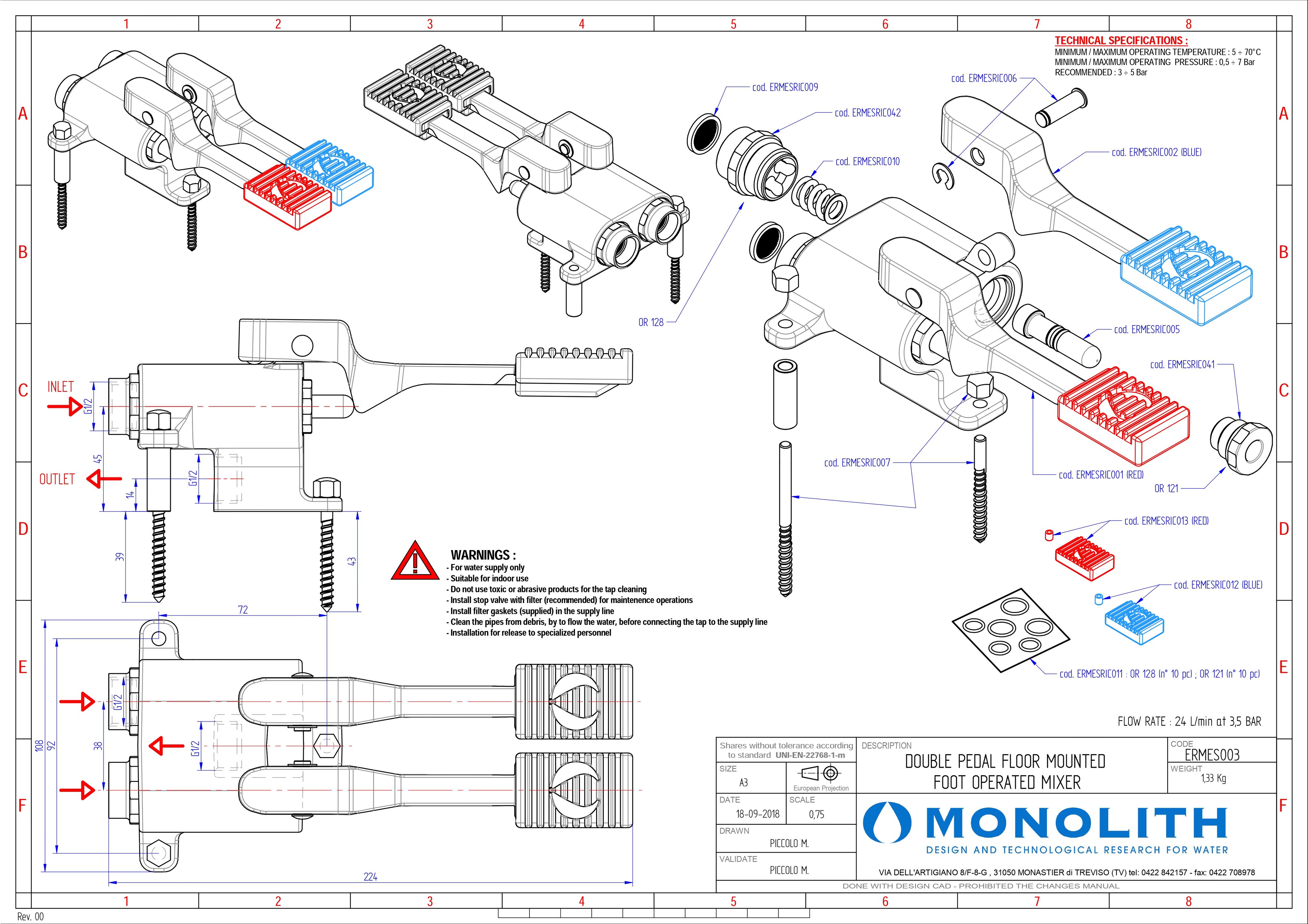 Педальный смеситель ERMES003 используется совместно с изливом на одну трубу и комплектом гибких подводок для установки в общественных местах, барах, ресторанах, пищевых производствах для обеспечения максимальной гигиены,