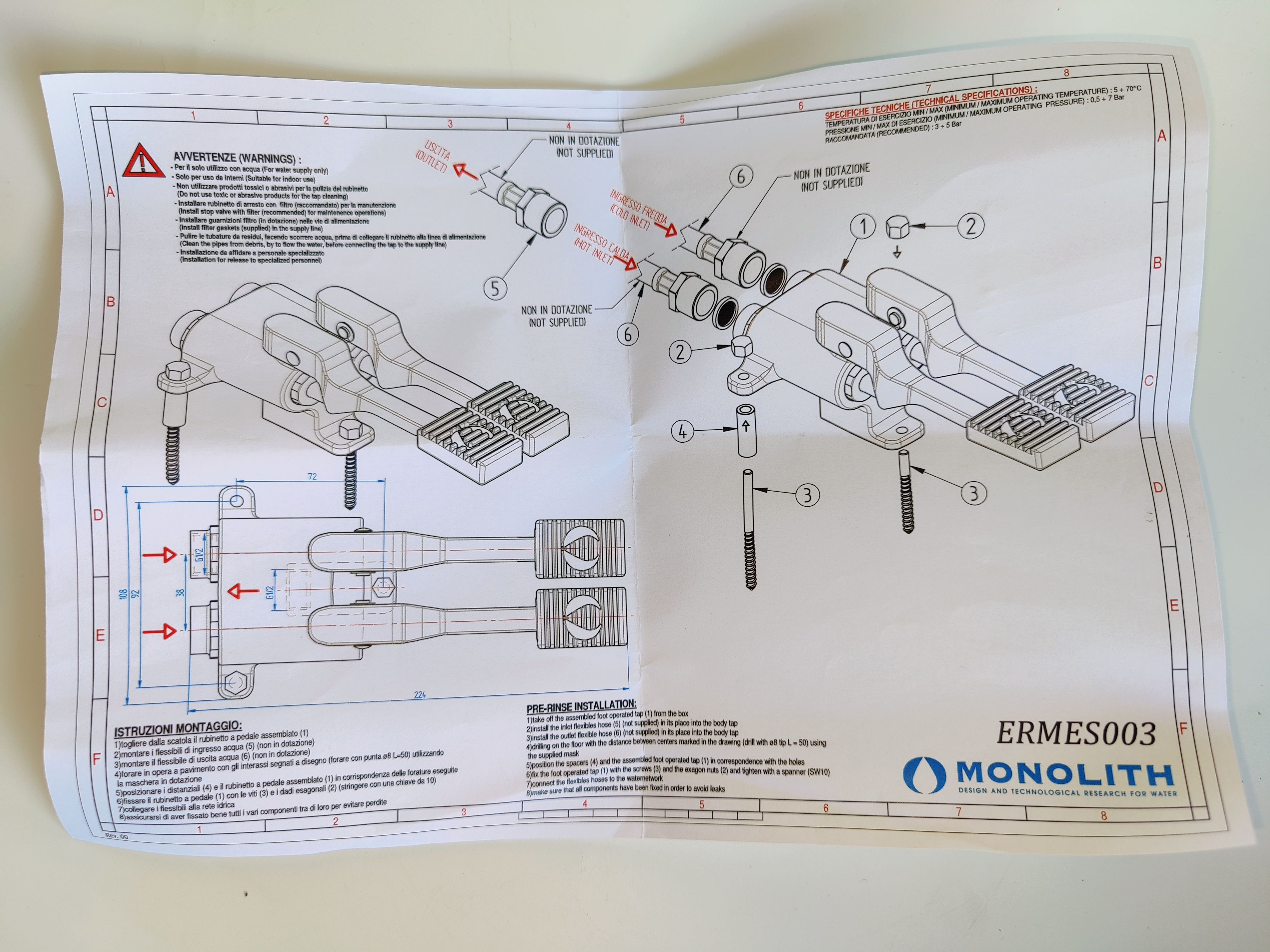 Педальный смеситель MONOLITH ITALY код ERMES003 (2 педали), холодная и горячая вода G1/2 |