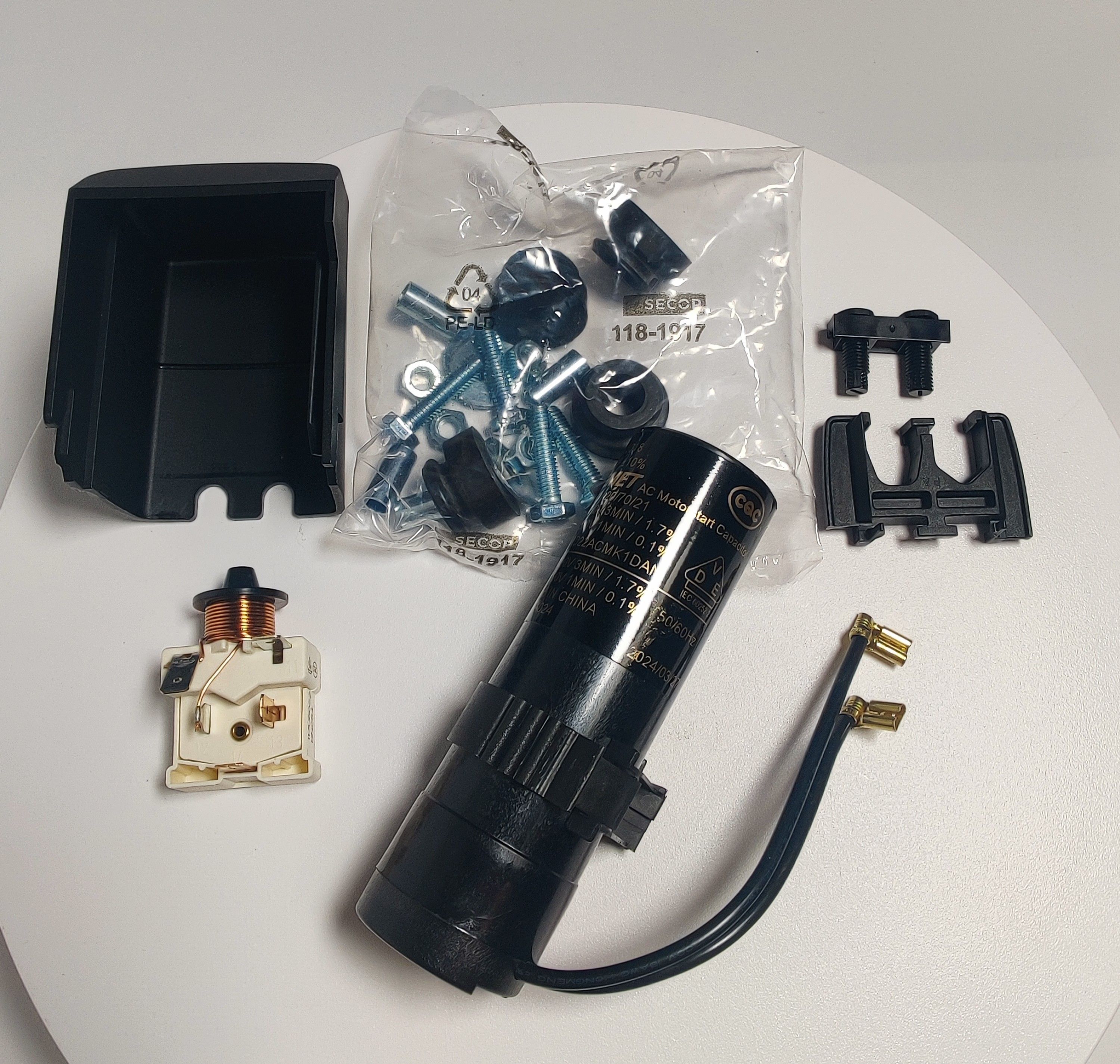 В комплект поставки входит - компрессор, пусковое реле, пусковой конденсатор, крышка, монтажный комплект. |